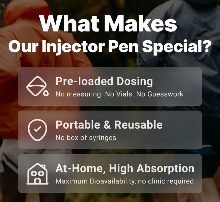 This is next-gen delivery. Instead of mixing vials and using multiple syringes, the injector pen is pre-loaded, reusable, and ultra-simple.